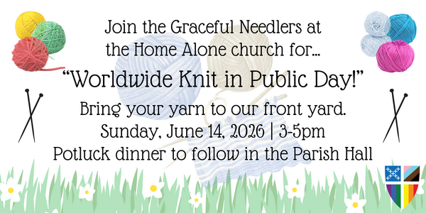 THE GRACEFUL NEEDLERS OF THE HOME ALONE CHURCH INVITE YOU JOIN US ON THE LAWN ON JUNE 14 TO CELEBRATE WORLD WIDE KNIT IN PUBLIC DAY!